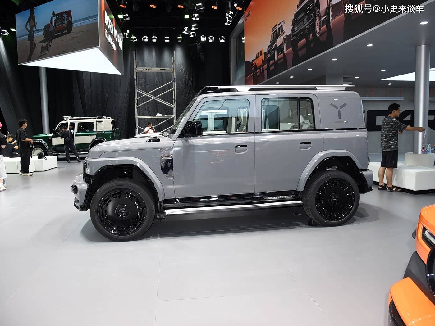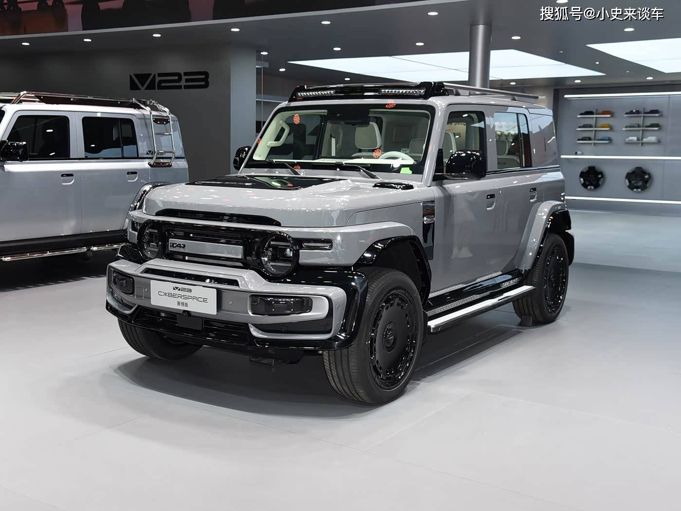 车身设计突破传统紧凑型SUV框架,4220mm车长搭配1915mm超宽体结构(高宽比0.96),通过四轮四角布局实现2735mm轴距最大化利用。赛博版专属哑光银车漆与熏黑轮眉形成强烈视觉反差,C柱V23标识与隐藏式门把手兼顾空气动力学与科技感。尾部创新采用侧开式尾门+外挂式储物盒设计,尾灯组模块化灯带点亮后极具辨识度,V23S车型通过红色S标与扩散器造型强化运动属性。